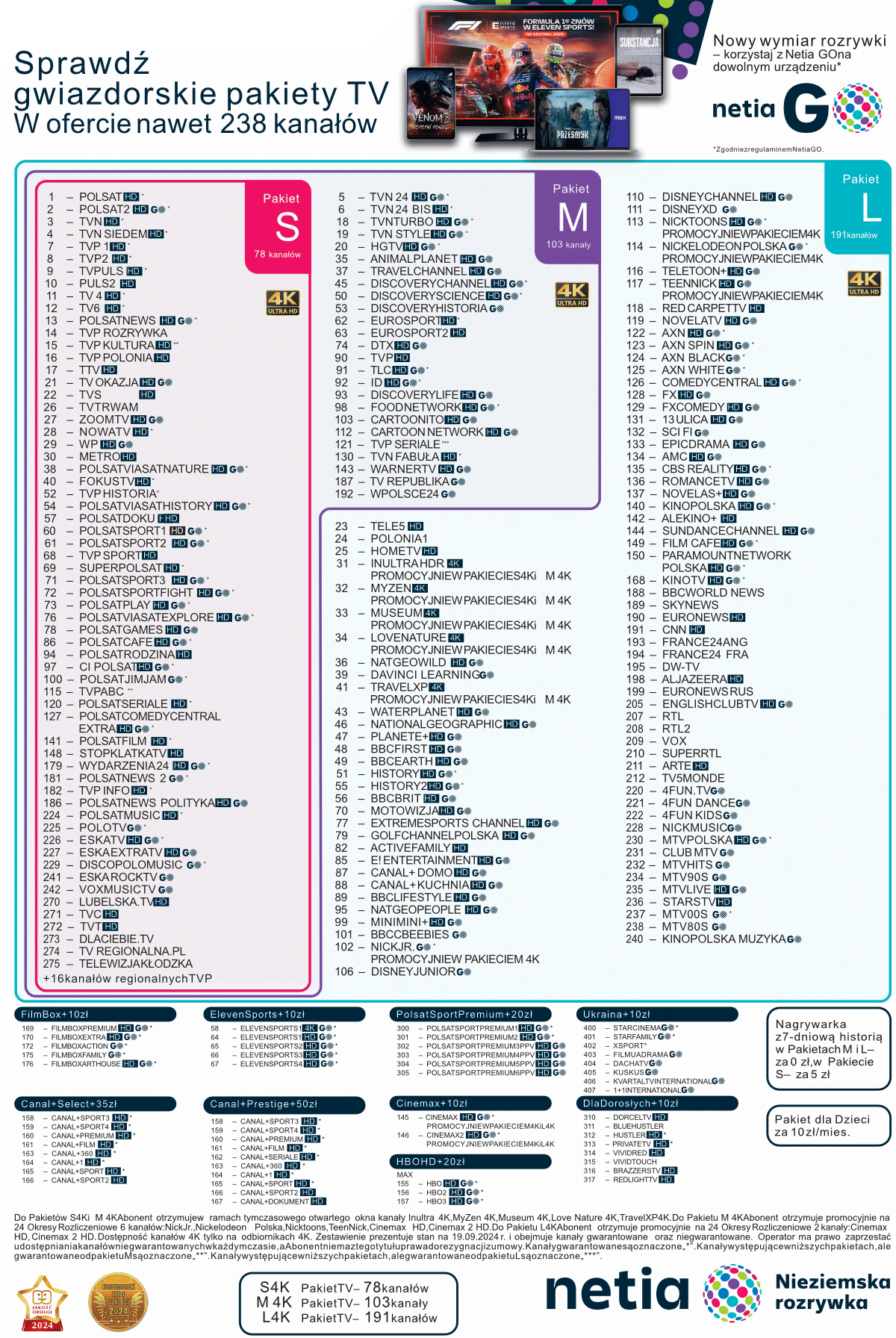 Prezentowane oferty Netii S.A.: „Nieziemska rozrywka III – szybszy Internet 6 mies. 1/2 Gb/s (PON, HFC, ETTH)”, „Nieziemska rozrywka III – szybszy Internet (PON, HFC, ETTH)”, obowiązują przy zawarciu Umowy na czas określony 24 pełnych Okresów Rozliczeniowych przy jednoczesnym korzystaniu z rabatów za e-fakturę (5zł) i zgody marketingowe (5zł). W przypadku rezygnacji lub niespełnienia warunków przyznania rabatów, cena wzrośnie o 10 zł. Wraz z pierwszą fakturą zostanie naliczona opłata aktywacyjna w wysokości 79 zł za Internet i 2 zł za Telewizję. W ofercie „Nieziemska rozrywka III – szybszy Internet 6 mies. 1/2 Gb/s (PON, HFC, ETTH)” po 24 miesiącach cena abonamentu wzrasta o 10 zł. W ofercie „Nieziemska rozrywka III – szybszy Internet (PON, HFC, ETTH)” po 24 miesiącach cena abonamentu wzrasta o 10 zł dla usługi Szybki Internet Max 600, o 15 zł dla usługi Szybki Internet Max 1000 i o 20 zł dla usługi Szybki Internet Max 2000. Szybki Internet Max (600, 1000, 2000) stanowi wyłącznie nazwę marketingową. Usługa Internetowa oparta jest na parametrach jakości wynikających z maksymalnych parametrów technicznych danej technologii, w jakiej świadczona jest Usługa Internetowa lub wynikających z ofertowych ustawień technicznych łącza. Prędkość 2 Gb/s (suma przepustowości na co najmniej dwóch urządzeniach) jest dostępna na technologii PON. Parametry świadczenia Usługi Internetowej, w szczególności parametry prędkości oraz wpływu innych Usług na Usługę Internetową, dostępne są na stronie netia.pl. Oferta jest ograniczona terytorialnie do zasięgu stacjonarnej sieci PON, HFC, ETTH Operatora.